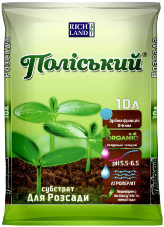 Субстрат Поліський для розсади - спеціальна торфосуміш, виготовлена на основі торфу дрібної фракції (0-6 мм) з додаванням піску, агроперліту та мінімальної кількості макро- та мікроелементів. Забезпечує швидке проростання насіння, краще укорінення розсади, підвищує вологоємність та хорошу аерацію, що сприятливо впливає на розвиток молодої кореневої системи.