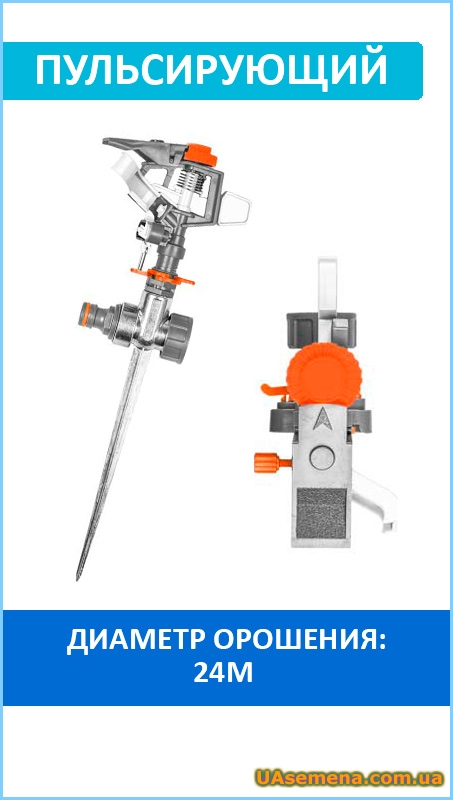 Поворотный пульсирующий ороситель на металлическом колышке. Регулировка угла поворота и наклона струи с фиксацией выбранного сектора. Регулируемый размер и форма области распыления. Блок для распыления выбранного сектора. Колышек имеет ниппель для быстроразъемных соединений и возможность последовательного соединения с другими оросителями.Диаметр орошения до ∅24м.