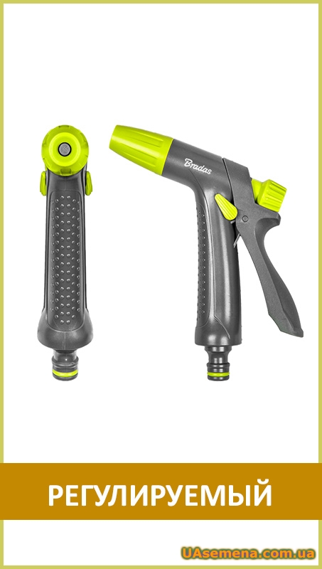 Писталет имеет рычаг включения выключения функции полива, регулируется радиус конуса струи, имеет блокиратор в положении полива.