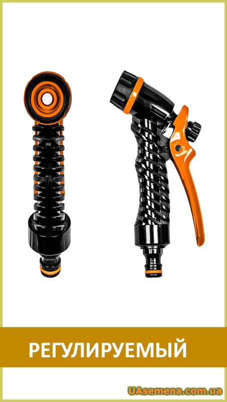 Короткий пластиковый пистолет с адаптером под коннектор, позволяет производить полив различными струями воды: от мелкого распыления до сконцентрированной струи. Регулируемая сила потока.