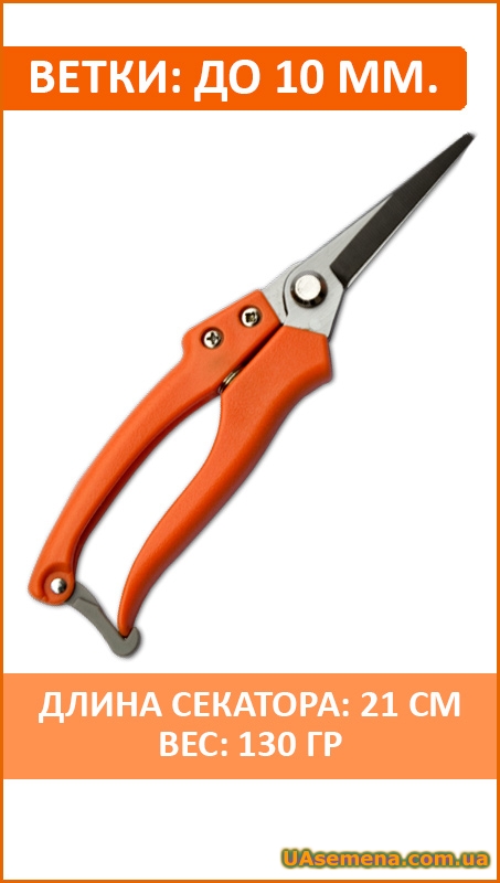 Прямые лезвия. Предназначен для точной обрезки цветов и кустов. Эргономичные ручки имеют резиновое покрытие, припятствующее выскальзыванию. Длинна секатора 20 см. Предназначен для обрезки цветов и побегов максимальной толщиной 10 мм в диаметре.