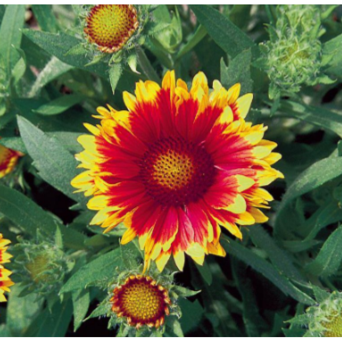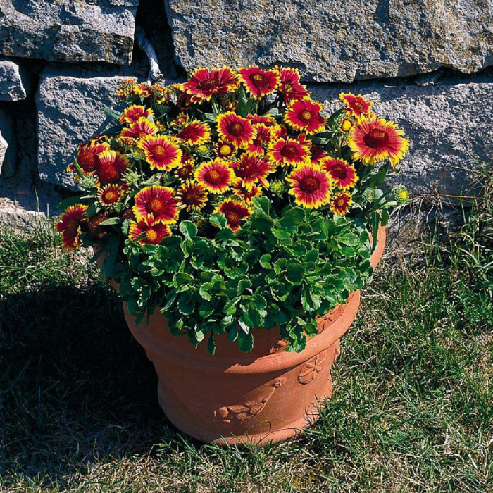 Гайлардия крупноцветковая Аризона (Gaillardia grandiflora Arizona). Самый компактный сорт. Высота 25-30 см. Соцветия яркие, большого размера, до 9 см в диаметре. Цветение обильное и длительное с июня по сентябрь. Находка для жаркого лета. Засухоустойчива, светолюбива культура. Предпочитает легкие, сухие почвы. Требует легкого укрытия на зиму. На рассаду высевают апрель-май. На постоянное место пересаживают в августе на расстоянии 20-25 см. Зацветают растения на следующий год. На одном месте растет 3-5 лет. Используется для клумб, рабаток, бордюров, в качестве оформления вазонов и контейнеров.