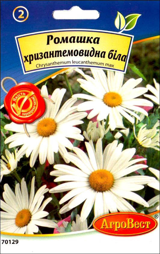 Популярное многолетнее растение, известное под названием "ромашка". Высота до 80 см. Крупные, в диаметре 6-10 см цветки с белыми широкими лепестками и желтой серединой. Обильное цветение в июне-июле. Используются для групповых посадок в цветники, рядами на рабатки, а также для срезки в букеты. В воде стоит 8-10 дней.