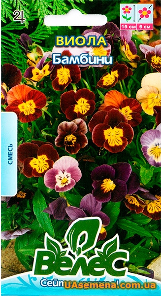 Многолетник из семейства фиалковые. Растение низкорослое, неприхотливое, формирует плотные и густые дернинки в форме подушки высотой 15 см. Цветки крупные (4-6 см), разноцветные, формируются в огромном изобилии и появляются с апреля по октябрь. Виола "Бамбини" зимостойкая, хорошо развивается на любой дренируемой почве, в полутени и на солнце. Чтобы растение зацвело в первый же год, семена высевают на рассаду (февраль-март). Если высевать семена прямо в грунт июне-июле, растение зацветет на следующий год. Сорт хорошо переносит пересадку в состоянии цветения. Виола используется в миксбордерах, на переднем плане бордюров и цветников, в альпинариях, каменистых горках. Рекомендуется делить кустики раз в 3-4 года.