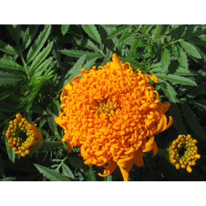 Однолетнее растение с крепкими прямостоячими стеблями, высотой 70-80 см. Соцветия крупные, хризантемообразные, махровые, диаметром 9-12 см, желтых, оранжевых и белых расцветок. Используется для декоративного оформления клумбы, цветников и среза в букеты.