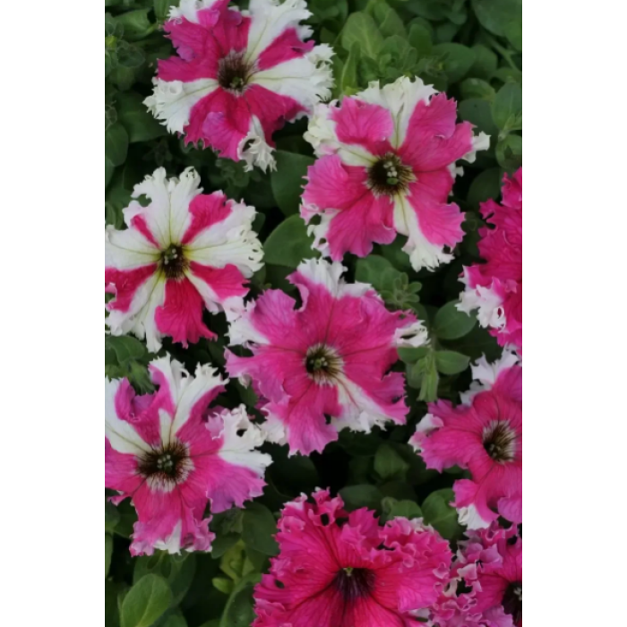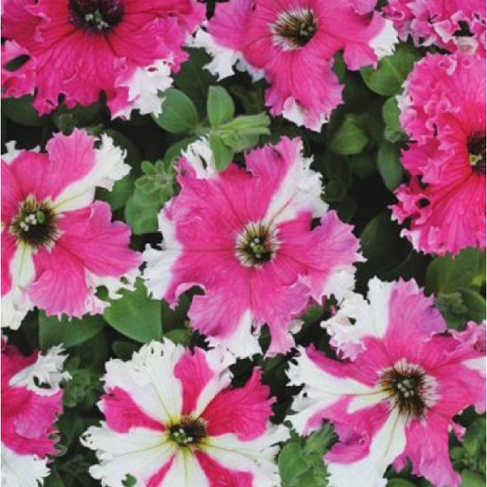 Растение крупное, высотой 35-40 см, слабо ветвистый. Прежде всего ценится крупными цветками, диаметром около 6 см с волнистыми, бахромчатыми, белыми краями, прекрасного окраса, темные розовые и фиолетовые пятна и полосы на белом фоне. Для того чтобы показать всю свою красоту петунии необходимо солнце. Очень эффектны в балконных ящиках, подвесных корзинах, горшках; с успехом можно выращивать в цветниках.