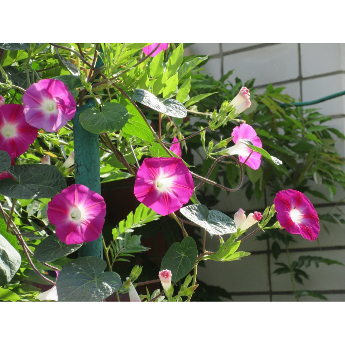 Ипомея Кружево (Ipomoea nil) – одна из самых красивых садовых лиан, которая порадует вас большими воронковидными цветами ярких цветов с белым ободком по краю. Стебли крепкие, длиной 1 м, хорошо облиственные. Цветение обильное и продолжительное, с июня до заморозков. Светло-, теплолюбивая культура, лучшей декоративности достигает на плодородных, легких почвах, требует регулярного полива. Размножают рассадным (конец марта – начало апреля) и безрассадным (май) способами. Перед посевом семена намачивают на сутки. При температуре 18 °С всходы появляются через 7-14 дней. На постоянное место ипомею высаживают в мае. Растения плохо переносят пересадку, особенно повреждение корневой системы, поэтому рассаду нужно очень осторожно вынимать из горшков, стараясь не разрушить грунтовой ком. Используют для вертикального озеленения.