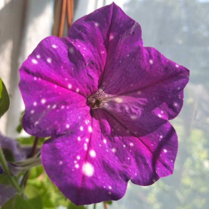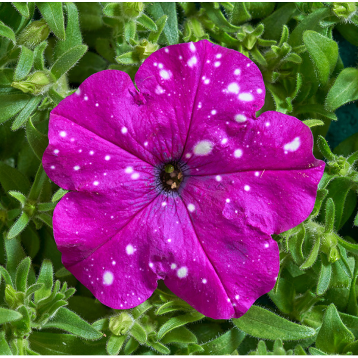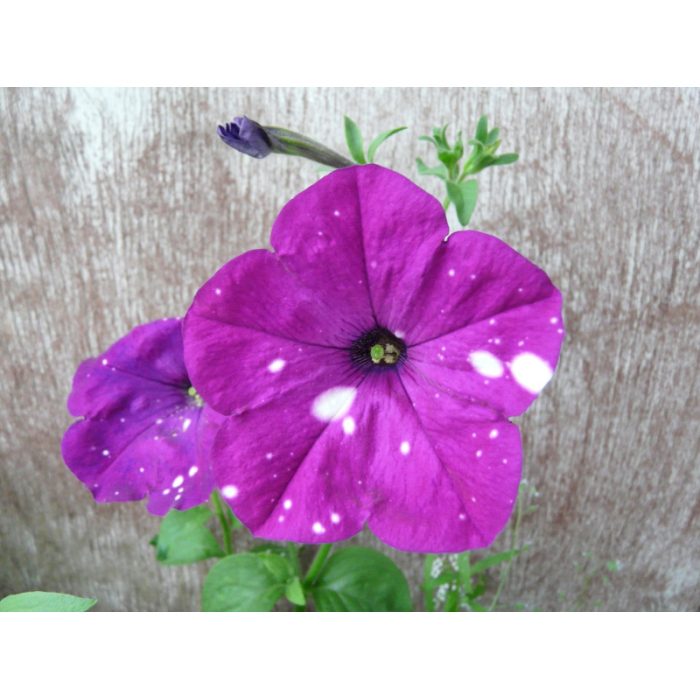 Уникальный дуэт петуний с белыми точками. Сочетание ярких и насыщенных окрасок и белых точек или пятнышек придают цветкам необычный привлекательный вид. Растение высотой 30-35 см, отлично ветвится, обильно цветет, цветок темной фиолетовой окраски с белыми каплями и крапинками, диаметром 6-7 см. Подходит для цветников, балконных ящиков и контейнеров. Растения быстро восстанавливают цветение после дождя.