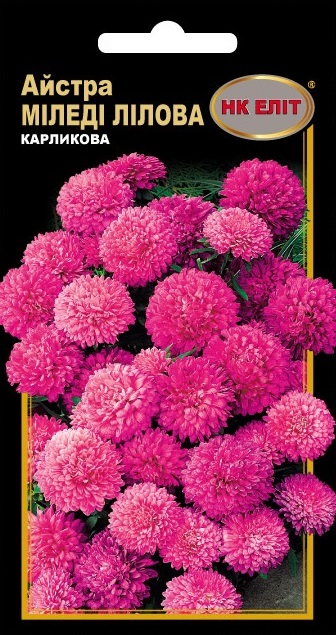 Астра Миледи лиловая – компактный, низкорослый сорт с крупными махровыми соцветиями насыщенного лилового цвета. Растение достигает высоты 20–25 см, формируя густые кустики, усыпанные яркими цветами диаметром 14–16 см.