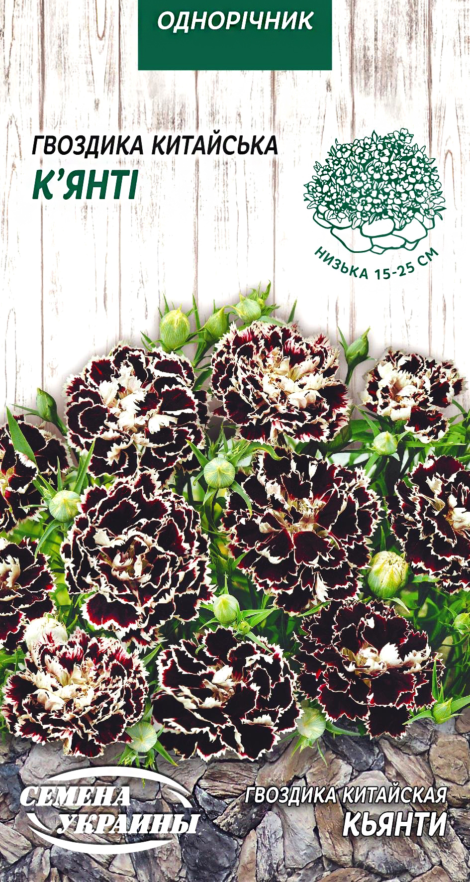 Гвоздика китайская сорта Кьянти — компактное декоративное растение с насыщенным, глубоким черным оттенком цветков и белой каймой. Цветки аккуратные, с резными лепестками, выглядят выразительно даже в небольших посадках.