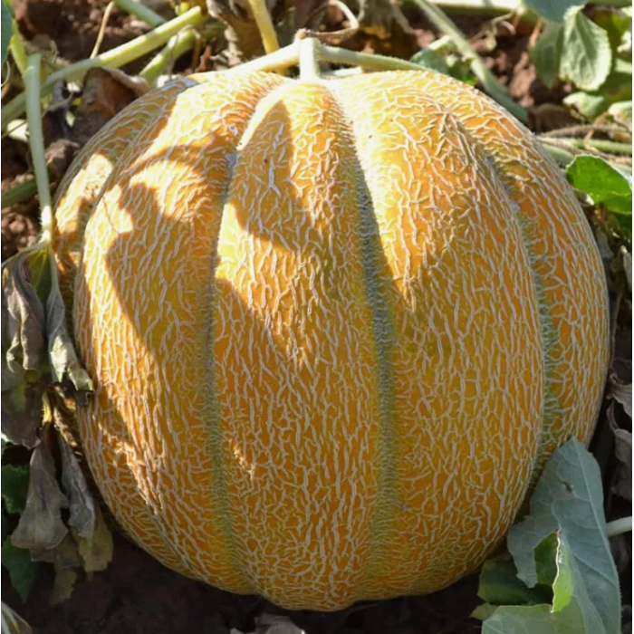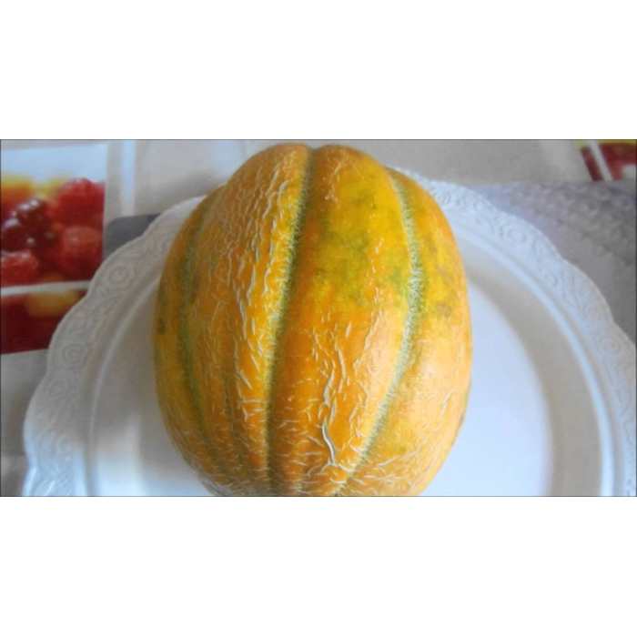 Плоды округло-овальные, с плотной сетчатой кожурой желтого цвета. Средний вес – 3–6 кг. Мякоть сочная, нежная, белая, с высоким содержанием сахаров, что делает сорт особенно вкусным.