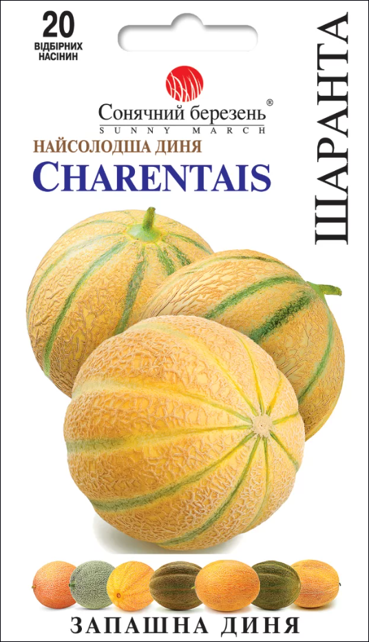 Попробуйте что-нибудь очень вкусное - эти небольшие настоящие французские дыни Charentais. Знаменитая Шарантская дыня была создана в Пуату Шарант (запад Франции) в 1920 году как наиболее изысканная, с насыщенным необычным ароматом. Дыня Шаранта, легендарная в Провансе, является наиболее потребляемым сортом во Франции, она идеальна для лета. Считается лучшей дыней, когда-либо созданной, из-за высокого содержания сахара, гладкой плотной текстуры и пьянящего аромата. Идеально подходит для двух порций, эти сравнительно маленькие круглые дыни весят 2-3 фунта (1-1,5 кг). Светлая полосатая кожура, покрытая плотной сеткой, с небольшими ребрами, очерченными зелеными полосками, приобретает яркий желтый цвет и сильный аромат при созревании, когда эти плоды легко отделяются от лозы. И это похоже на хитрость, чтобы собрать их до того, как они перезрели. Созревает через 70-80 дней от всходов. Её очень сладкая, сочная, и твердая оранжевая мякоть с небольшой полостью семян имеет необычный тропически экзотический аромат. Эту необычную дыню употребляют в любое время еды, вместе с другими продуктами, или отдельно, в виде десерта, с винами Порто или Мадейра.