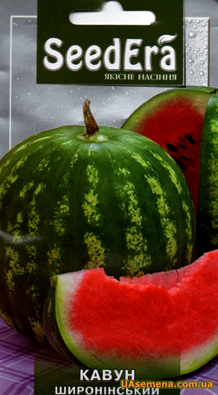 Сорт "Широнинский" вызревает за 80-85 дней, то есть является ранним. За вегетацию наращивает ягоды, массой по 2,5-3 кг. Мякоть у них приятная на вкус и выглядит красиво, имеет розово-малиновую окраску. Сочности и сладости этому арбузу не занимать. Также он стойкий против болезней и может пережить засушливый период. Плоды шаровидной формы, окраска - светло-салатного цвета в зеленую полоску.