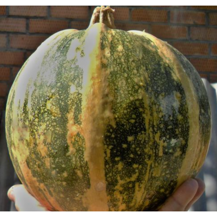 Среднеплетистый сорт твердокорой тыквы. Зреет на 102-110 день. Плод круглый, слегка ребристый, весом 3-5 кг, желтого цвета с широкими темными зелеными пятнами. Мякоть светло-желтая, вкусная, не слишком сладкая. В семян отсутствует твердая оболочка. Сорт универсального назначения. Используют в свежем виде, кулинарии, и для получения семян.