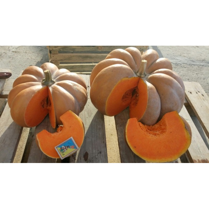 Высокоурожайный, среднеспелый сорт тыквы, массой 5-8 кг. Форма плода - округло-приплюснутая, с сигментированной поверхностью. При созревании приобретает яркий оранжевый цвет как снаружи, так и внутри. В технической спелости - серый. Сорт имеет небольшую семенную камеру и высокое содержание сахара и сухих веществ - более 10%. Отлично хранится в зимний период для продажи на свежем рынке. Используется для приготовления пюре, соков и концентратов. Лидер по вкусовым и товарным качествам.