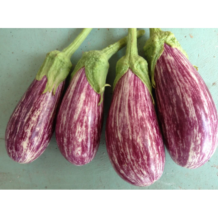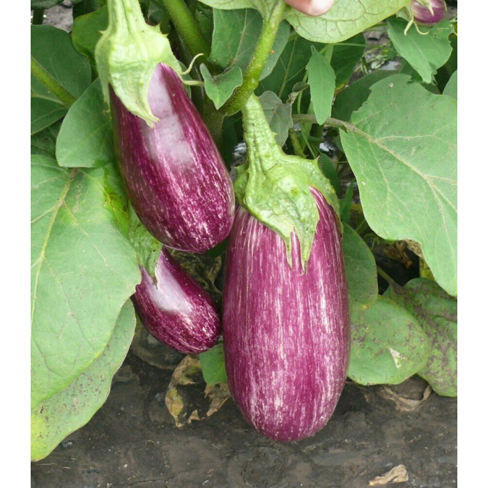 Баклажан Пандора, полосатая роза, не просто красив, он потрясающий! Округло-овальные толстые плоды длиной около 15-20 см с поразительно красивым белым цветом глянцевой кожи, покрытой баклажановыми и сиреневыми полосами. Кожица нежная и тонкая, не требующая очистки при приготовлении, вкус мягкий и сладкий, белая мякоть плотная и малосемянная. Невысокие, но роскошные растения высотой 16 дюймов (40 см) и до 30 дюймов (75 см) в ширину с большими темно-зелеными листьями начинают плодоносить через 80-90 дней после пересадки. Этот надежный урожайный ранний сорт даже в разгар жаркого лета и в периоды с небольшим количеством осадков.