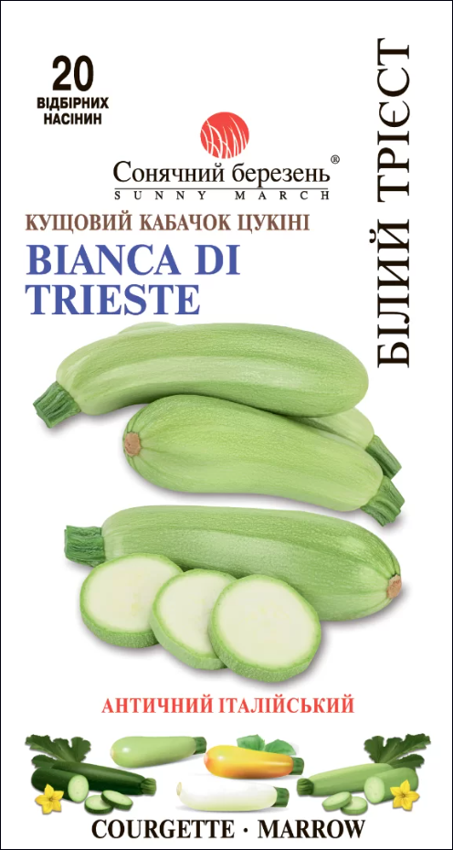 Этот надежный сорт и популярный рыночный кабачок родом из Северной Италии. Дает непрерывный урожай зеленых светлых кабачков на сильнорослых кустовых растениях все лето. Плоды белые с сочным, богатым сливочным вкусом и плотной текстурой. В среднем эти кабачки достигают размера 20 см и веса 500-700 г. Имеют цилиндрическую гладкую форму. Их лучше собирать при достижении 12 см в длину, когда они обладают наилучшими вкусовыми качествами.