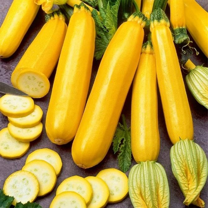 Кустовой урожайный цуккини с красивыми желтыми блестящими плодами ровной цилиндрической формы. Желтые кабачки выделяются на фоне темных зеленых листьев, что делает их легкими для поиска. Это специально выведенный сорт цуккини, позволяющий собрать плоды небольшого размера (они не перерастают слишком долго) в ранние сроки. Эти кабачки весят 0,5–1 кг и вырастают до 15–25 см длиной. Их кожица гладкая и тонкая, полностью съедобная. Мякоть плотная, с очень хорошим ореховым вкусом.