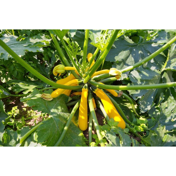 Кустовой урожайный цуккини с красивыми желтыми блестящими плодами ровной цилиндрической формы. Желтые кабачки выделяются на фоне темных зеленых листьев, что делает их легкими для поиска. Это специально выведенный сорт цу... Читать далее...