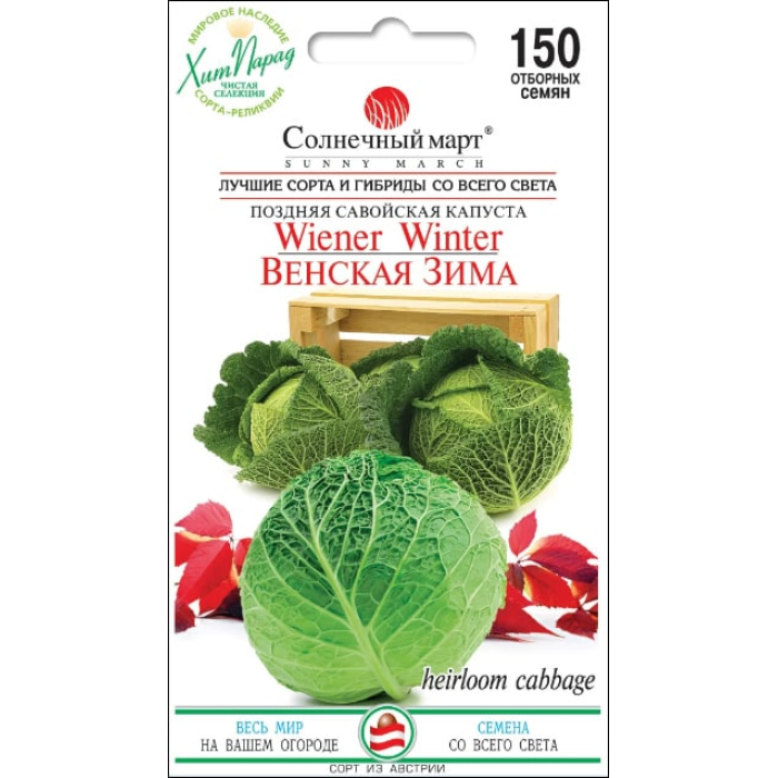 Старинный сорт, который выращивают ради прекрасного крупного кочана, плотного по всему диаметру и тяжелого по отношению к размеру. Эффектная морщинистая поверхность листьев, характерный сладкий тонкий вкус и необычная нежная текстура внутренних листьев с мелкими пузырьками – это яркие особенности савойской капусты. Кочаны округлые, весом 2,5-3,5 кг, плотно завернутые гофрированными темными зелеными листьями. Этот поздний (90 дней от высадки рассады) морозостойкий зимний сорт дает капусту, способную выдерживать даже суровые холода, хорошо держаться на корню, не перерастая и не растрескиваясь. Она созревает в октябре-ноябре и держится на хранении до конца весны. Венская зима самая нежная и сладкая из савойских капуст, с необычайным вкусом и мягкой текстурой, что делает её предпочтительной для использования во многих рецептах с кочанными капустами.