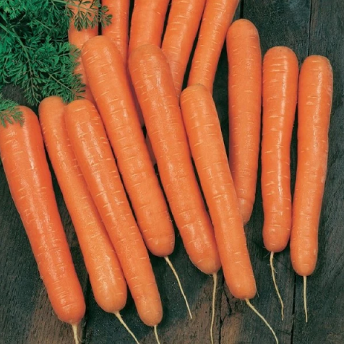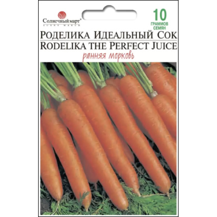 В Европе Роделику выращивают специально для морковного сока. Один укус, и Вы поймете, почему- она наполнена сочным, сладким, настоящим морковным вкусом! Улучшенный отбор из германского сорта Rothild, этот сорт был выведен для высоких показателей Брикса (сладости) и для приготовления высококачественного сока. Длиной 6-8 дюймов (15- 20 см) с немного широкими плечами, сужающимися к округленному кончику, с яркой оранжевой окраской. Хорошо справляется с тяжелой почвой. Созревание начинается через 70-75 дней после всходов. Хорошая крупная, гладкая морковь для хранения, сильный, сладкий аромат которой усиливается при готовке. При посеве в марте-апреле будьте готовы делать сок с июля и до поздней осени, а для хранения сорт сеют в мае-июне.