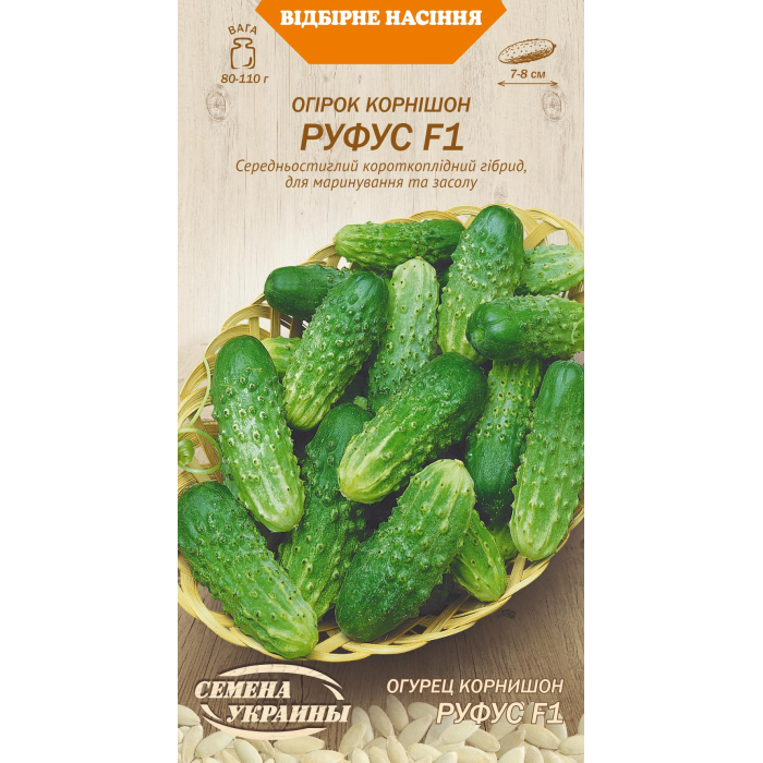 Среднеспелый гибрид. Период от всходов до начала спелости 50-55 дней. Плоды небольшие, цилиндрической формы, бугорчатые, длиной 7-8 см, весом 80-110 г, насыщенной зеленой окраски. Без ГМО.