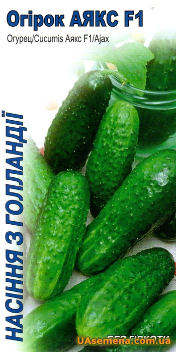 Аякс F1 - сверхранний сорт, пчелоопыляемый. Открытый грунт, пленочные укрытия. Обильное завязывание плодов (первая завязь за 4-5 листом). Формирует несколько зеленцов на одном узле. Высокий стабильный урожай, не желтеют. Отличный вкус, без горечи. Хорошая лежкость. Устойчив к вирусу табачной мозаики и мучнистой росе.Превосходные засолочные качества.