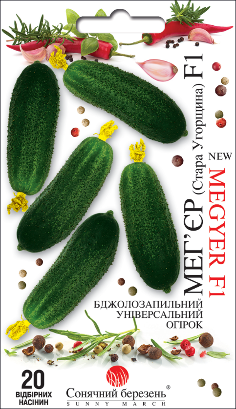 Огурец Мегьер F1 — гибрид венгерской селекции, сочетающий высокую урожайность, среднеспелость и отличные вкусовые качества. Растения энергичные, формируют большое количество завязей, плодоносят дружно и продолжительно. Зеленцы цилиндрические, длиной 10–12 см, тёмного зелёного цвета с мелкими бугорками и светлыми полосками. Мякоть плотная, хрустящая, сочная, без горечи. Подходит для свежего употребления, засолки и консервирования.