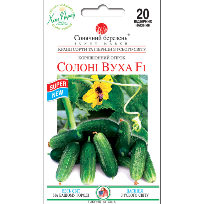 Гибрид Солёные уши F1 — оригинальный огурец для свежего потребления и переработки, который особенно ценится за хрустящие и вкусные плоды. Зеленцы небольшие, длиной 7–9 см, цилиндрической формы с яркой зелёной кожицей и мелкими бугорками. Мякоть плотная, ароматная, без горечи. В засолке и маринаде плоды сохраняют упругость, остаются сочными и аппетитными.