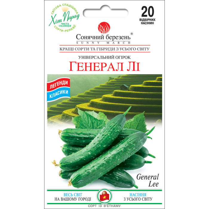 Этот традиционный вьетнамский сорт прочно утвердился, как один из «великих» в мире огурцов, ставши основой для многих американских и европейских гибридов. Он является стандартом салатного огурца благодаря своему восхитительно свежему, сладкому вкусу, хрустящей текстуре и мягкому аромату. Высокоурожайный сорт, очень устойчивый к болезням, что делает его отлично подходящим для ранних и поздних посевов. Универсальный и выносливый, этот огурец имеет большой вес в азиатской кухне, отличаясь от западных сортов удлиненной формой, редкой бугорчатой тонкой кожицей и меньшей семенной полостью. Генерал Ли – это красивый темный зеленый огурец, который собирают в размере 6–8 дюймов (15-20 см), примерно через 50 дней после всходов. Плоды сохраняют свой размер и форму даже при плохих погодных условиях, в отличие от других сортов, которые могут скручиваться и деформироваться, тогда как эти 5-фунтовые (1,5 м) длинные лозы продолжают завязывать огурцы для регулярного сбора. Непревзойденный вкус.