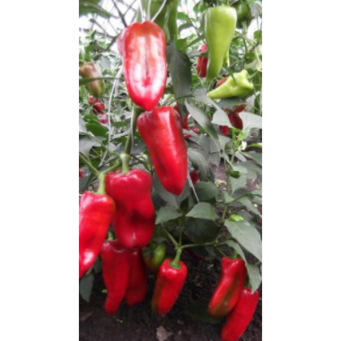 Среднеспелый сорт. Период от всходов до начала спелости 130-150 дней. Кусты высотой 80-100 см. Плоды очень большие, массой 300-700 г, длиной 18-25 см, призмовидной формы, диаметром 10-12 см, красной окраски. Толщина стен 8-10 мм. Без ГМО.