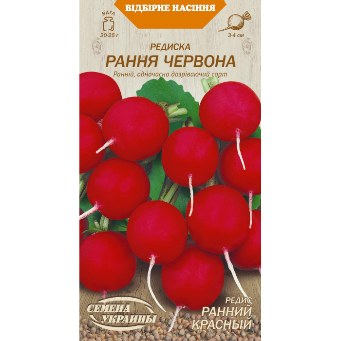 Ранний сорт. Период от всходов до созревания 22-25 дней. Корнеплоды небольшие, округлой формы, диаметром 3-4 см, массой 18-23 г, красного цвета. Без ГМО.... Читать далее...