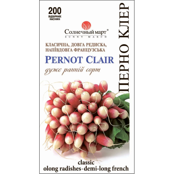 Этот старинный сорт-находка для тех, кто любит самый ранний сорт 18 дней, но кому не хватает насыщенности и пикантного вкуса. Pernot созревает на 2 дня позже, но его прозрачная мякоть успевает наполнится всеми оттенками вкуса, свойственного поздним редисам. Его удлиненные корнеплоды имеют белую светящуюся мякоть, которая отличается необычайно нежным, но насыщенным вкусом. Кожица темная красная, с характерной белой точкой на кончике.