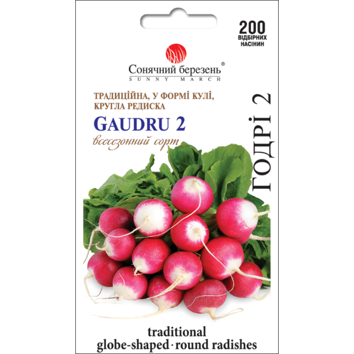 Годри 2 — ранний сорт редиски с дружными и ровными корнеплодами. От появления всходов до сбора урожая проходит 20–25 дней. Корнеплоды округлые, гладкие, насыщенные красные, с белой, сочной, хрустящей мякотью без пустот и с лёгкой остротой. Сорт устойчив к растрескиванию и стрелкованию, формирует стабильный урожай даже при перепадах температуры. Отлично подходит для ранневесеннего и летнего посева, пригоден для выращивания в открытом грунте и плёночных укрытиях.