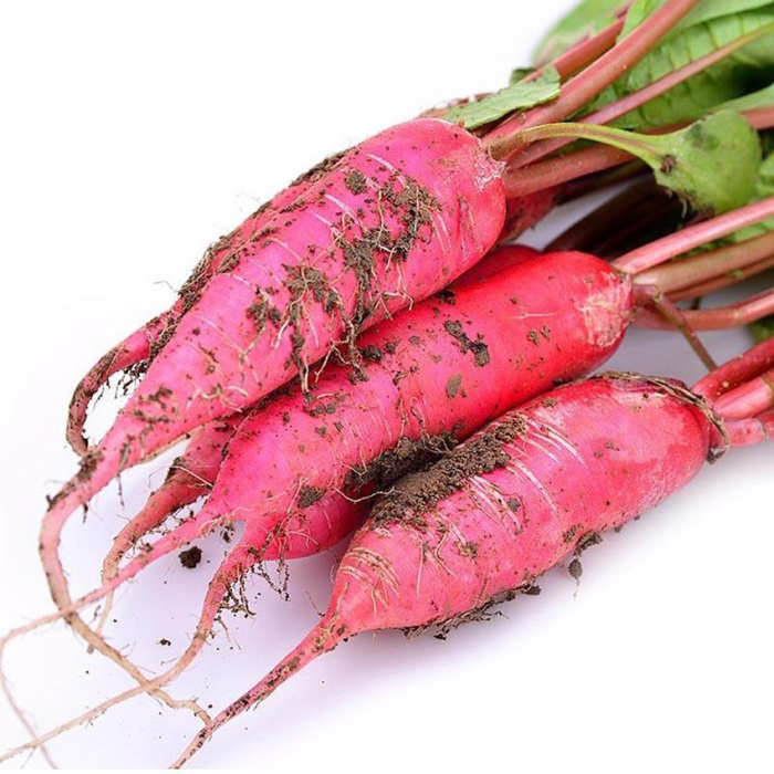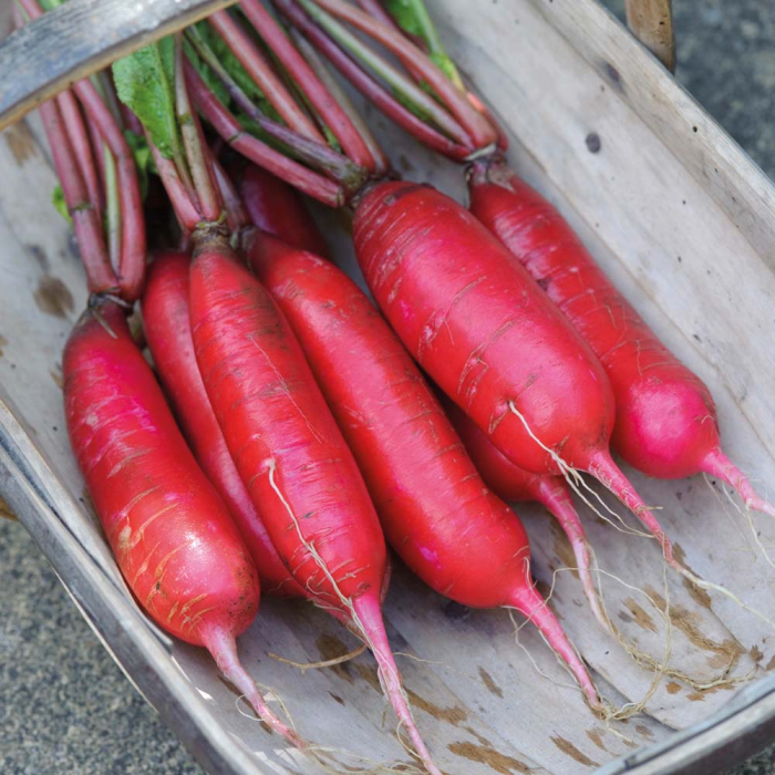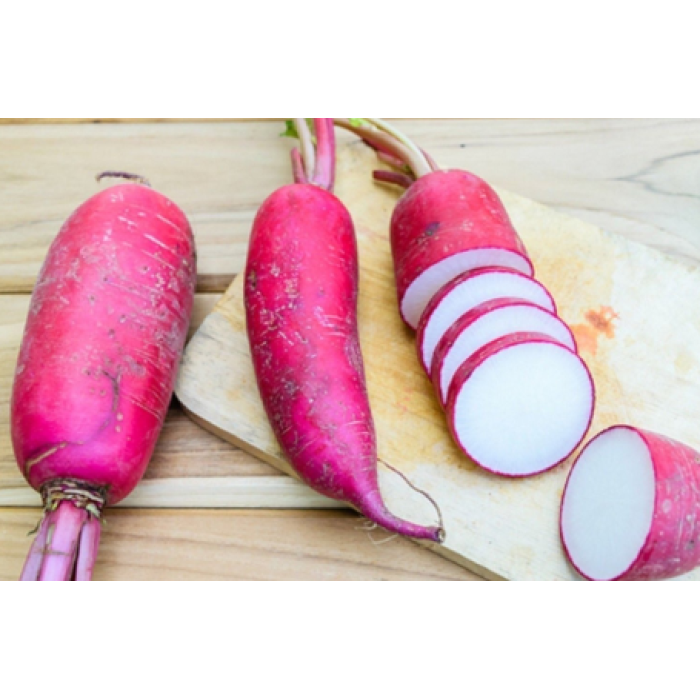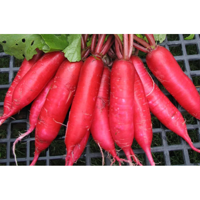 Корнеплоды красные. Вегетативный период 45-60 дней. Масса корнеплода 100-120 г, иногда до 300 г. Мякоть белая, сочная, вкусная, слабоострого вкуса. Розетка - 6-10 листьев, прямостоячая. Листья цельные или лопастные. Отли... Читать далее...
