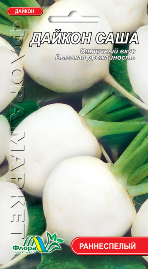 Дайкон (сладкая редька), создан в Японии, где и занимает первое место по посевной площади среди овощей. Саша - ранний сорт, вегетационный период 35-45 дней. Используется в свежем виде. Корнеплод округлый, длиной до 10,5 см, белый, гладкий. Мякоть белая, нежная, плотная, очень сочная. Масса корнеплода от 100 до 400 г. Корнеплоды хорошо сохраняются в течение 1-2 месяцев.