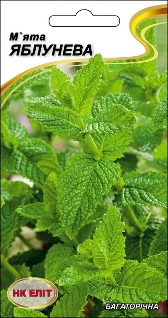 Мята Яблочная - многолетнее растение. Куст ветвистый, высотой - 45-75 см. Листья яйцеобразной формы, зубчатые, темной зеленой окраски, с сильным ароматом. Сбор листьев проводят в период цветения, когда в них накапливается наибольшее количество эфирных масел. В еду употребляют свежие и сушеные листья, молодые побеги и цветки. Их используют для ароматизации чая, разнообразных напитков, кондитерских изделий, добавляют к салатам, овощным и мясным блюдам, в качестве специи используют при соленье огурцов, кабачков и томатов. Выращивают рассадным способом.