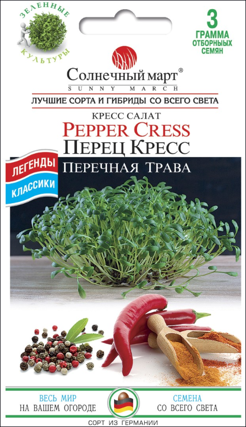 Перец кресс — ультраранний пряно-листовая культура с ярко выраженным вкусом и ароматом, напоминающим свежемолотый перец. От появления всходов до первой срезки проходит всего 12–18 дней. Листья нежные, сочные, тёмные зелёные, богаты витаминами и минералами. Идеальны для добавления в салаты, холодные закуски, украшения бутербродов и горячих блюд. Подходит для круглогодичного выращивания — в открытом грунте весной и осенью, а также на подоконнике или в теплице зимой.