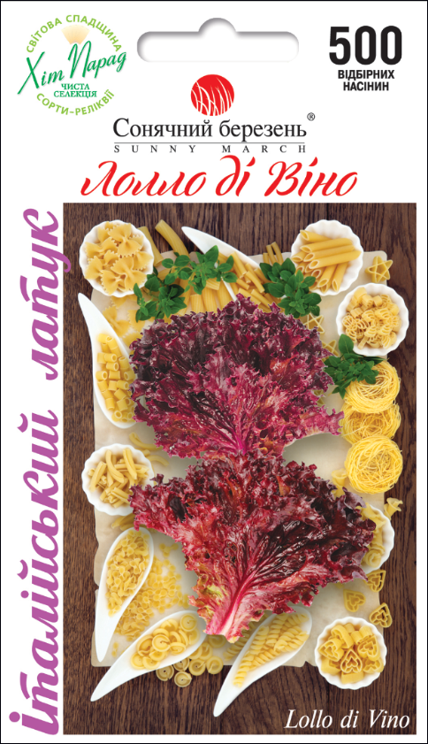 Салат Лолло ди Вино – декоративный полукочанный сорт с яркой окраской и отличными вкусовыми качествами. Формирует плотную розетку с ажурными, сильно гофрированными листьями красного цвета. Вегетационный период составляет 40–45 дней. Листья нежные, сочные, с легкой пикантной ноткой, богаты витаминами и минералами.