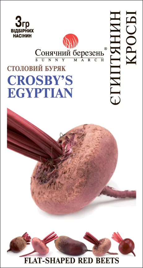 Эта свекла невероятно популярна на протяжении поколений и является верным выбором для сладких, вкусных корнеплодов! Несмотря на свое название «Ранний Египтянин Кросби», эта свекла попала в Америку через Германию, а не из Египта. Этот замечательный рыночный сорт был усовершенствован Josiah Crosby. Он отобрал суперплоскую форму блюдца с более гладкой кожицей и темно-бордовой мякотью, нежной и ароматной, без волокнистых нитей. Немецкий импорт стал более привлекательным для продажи на рынке, благодаря однородным и красивым корнеплодам. Корнеплоды плоско-округлые, окрашены в темно-красный цвет вырастают до 6 дюймов (15 см) в диаметре. Прямостоячие ярко-зеленые листья растут до 16 дюймов (40 см) в высоту. Начинает созревать через 45 дней после всходов, у египетской свеклы очень быстрый рост в начале сезона. Корни формируются над землей и зрелую свеклу можно вырывать, а не выкапывать.