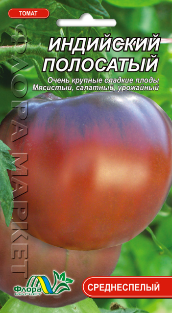 «Индийский полосатый» (Indian Stripe) - среднеспелый сорт родом из США. Индетерминантный, куст высотой до 1,8 м формируют в 2-3 стебля, требует подвязки и пасынкования. Плоды плоскоокруглые массой до 300 г. Зрелые томаты темного розового цвета со слабо заметными бурыми полосками. Вкус плодов отличный, сладкий. Сорт очень урожайный, рекомендован для открытого грунта и теплиц. Превосходно подходит для приготовления соков, салатов и переработки.