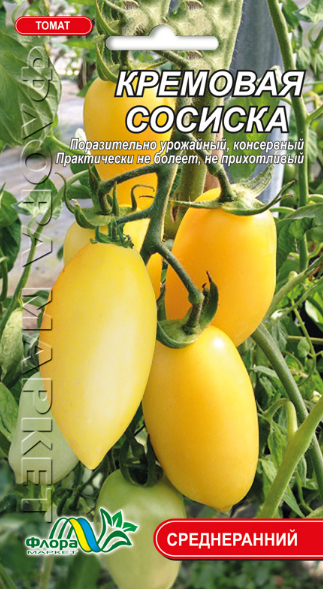 "Кремовая сосиска" (Cream Sausage) ранний, детерминантный сорт (80-110 дней). Куст 60-80 см, в теплице до 1-1,2 м (пасынкуется до первой кисти). Поразительно урожайный, продуктивный сорт! Плоды сливка, консервного назначения. Все томаты выровненные, примерно одного размера и формы, весом 100-130 г, не мельчают к концу урожая. Цвет зрелых плодов желтый. Вкус мягкий, томатный. Кожица тонкая, прочная - плоды долго хранятся после сбора и не лопаются при консервации. Дает урожай при любых погодных условиях. Практически не болеет (слабо вершинной гнилью).