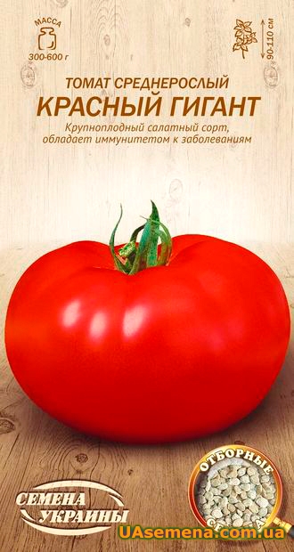 Среднеспелый, созревает на 100-110 день после всходов. Растение индетерминантное, сильнорослое (высотой до 1,5 м). Плоды крупне, массой от 200 до 500 г и больше, плоско-округлой формы, красного цвета, с нежной кожицей. Мякоть плода мясистая, сочная, сладкая на вкус. При хорошем уходе плоды сорта Красный гигант достигают 600 г и больше. Ценность сорта - высокая урожайность (10-12 кг/м2), устойчивость к основным заболеваниям, длительный период плодоношения и отличные вкусовые качества.