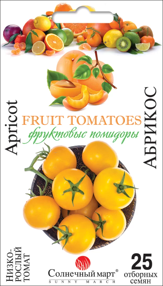 Желтые, как южные абрикосы, плоды поспевают на огородной грядке почти одновременно с тепличными помидорами. Эти томаты своей формой и сладостью очень похожи на абрикосы! Желтые плоды массой по 80-100 г каждый – достойные конкуренты сладких ягод! Ранний (90-110 дней) сорт томата для открытого грунта. Куст низкорослый, но требует подвязки к опоре и частичному пасынкованию из-за своей высокой урожайности. Мякоть сахаристая, малосемянная. Назначение десертное для диетического питания. Прекрасный для цельноплодного консервирования и приготовления высококачественного сока.