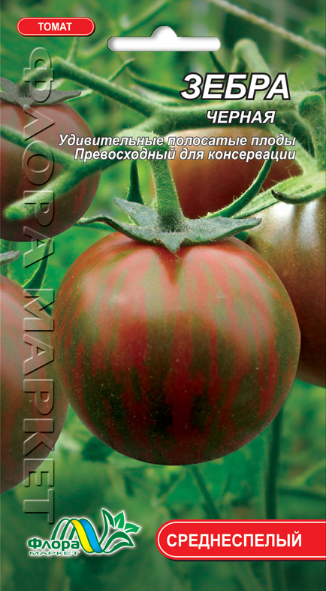 "Зебра черная" - индетерминантный среднеспелый сорт томата для теплиц и открытого грунта. Куст высотой 1-1,3 м, требует подвязки. Плоды круглые, выровненные весом до 110 г. Спелые плоды пестрые - красные и желтые полоски на темном красном фоне. Вкус очень приятный, сладковатый с необычной фруктовой кислинкой. Консистенция плодов умеренно плотная, кожица нежная, прозрачная. Сорт урожайный и достаточно устойчивый к заболеваниям. Прекрасно подходит для цельноплодного консрвирования и салатного применения. Незаменим для необычной сервировки стола!