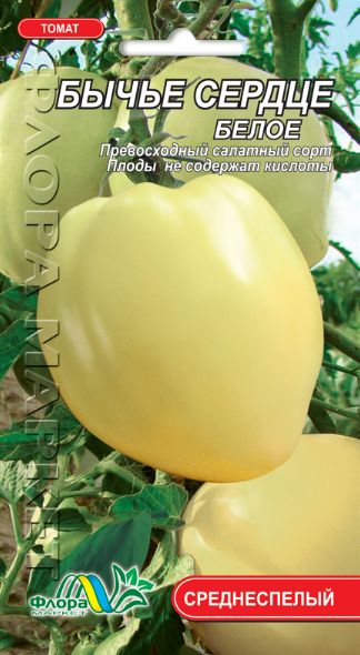 Популярный крупноплодный среднеспелый сорт (90-100 дней). Формирует превосходные, характерные плоды “сердца” белого цвета. Мякоть светлая желтая, плотная, отличного вкуса. Как и многие белые томаты, этот сорт совершенно не содержит кислоты - плоды сладкие и очень ароматные. Растение мощное, сильнорослое (индетерминантное). Куст достигает высоты более 1,5 метров и требует подвязки. На главном стебле формируется 4-5 кистей, в кисти до 5 плодов. Плоды крупные, весом 150-250 г, салатного назначения. Некоторые могут достигать веса в 600-800 г. Выращивают преимущественно через рассаду. По урожайности не уступает классическим сердцевидным сортам.