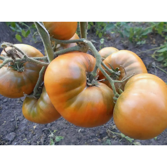 Томат Улуру Охра – полудетерминантный сорт с уникальными темными оранжевыми с зелеными полосками плодами и превосходным вкусом. Вегетационный период составляет 65–70 дней. Растение высотой до 1,2 м, требует подвязки и регулярного пасынкования. Плоды крупные, мясистые, с гладкой поверхностью, массой до 450 г. Мякоть сочная, сладкая, с легкой кислинкой.