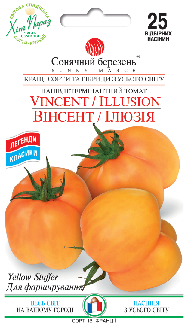 Винсент - это совсем другой помидор! Крупные светлые желтые томаты, иногда с розовым румянцем, абсолютно пустые внутри, перцевидные (обычно с четырьмя лопастями), идеально подходят ря того, чтобы наполнить их разными начинками и вкусами. Плоды имеют диаметр около 8 см.