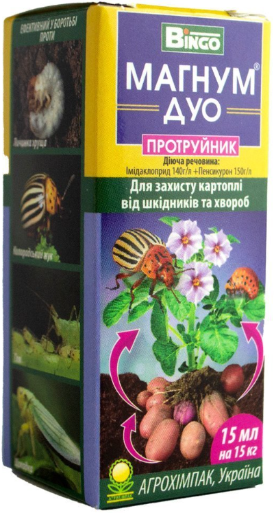 Магнум Дуо – инсектицидно-фунгицидный препарат контактного и системного действия для комплексной защиты картофеля от болезней и вредителей. Обладает длительным защитным периодом (до 60 дней) с эффектом стимуляции роста и развития растения. Протравитель не влияет на вкусовые качества картофеля, а также безопасен для полезных насекомых и окружающей среды.