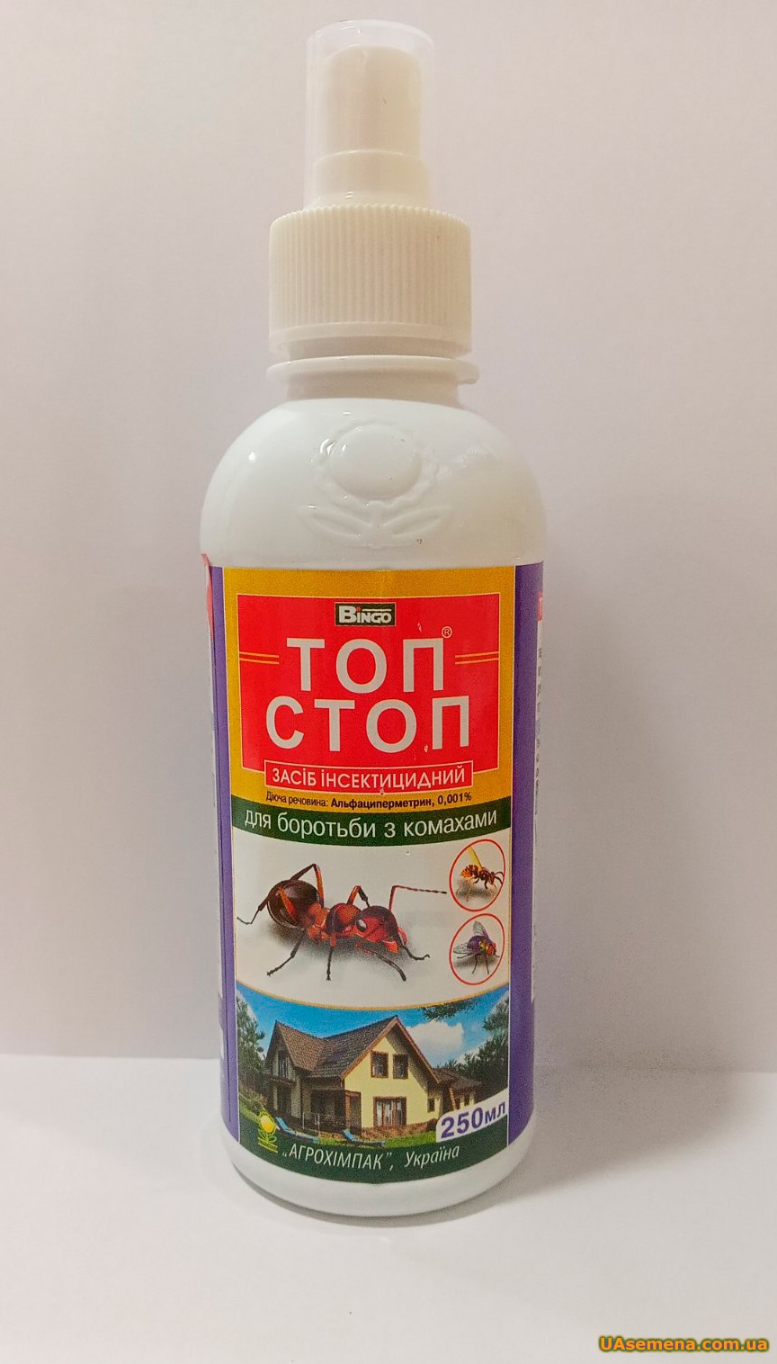 ТОП СТОП - эффективный, готовый к применению инсектицид для уничтожения летающих и ползающих насекомых в жилых и производственных помещениях; для профилактической дезинфекции пищевых, учебных, санитарно-лечебных и подсобных помещений, в местах массового отдыха и торговли, общественного питания, транспорте. Применять только при отсутствии людей.